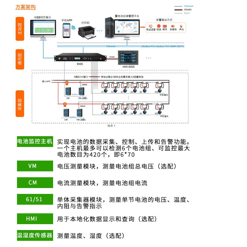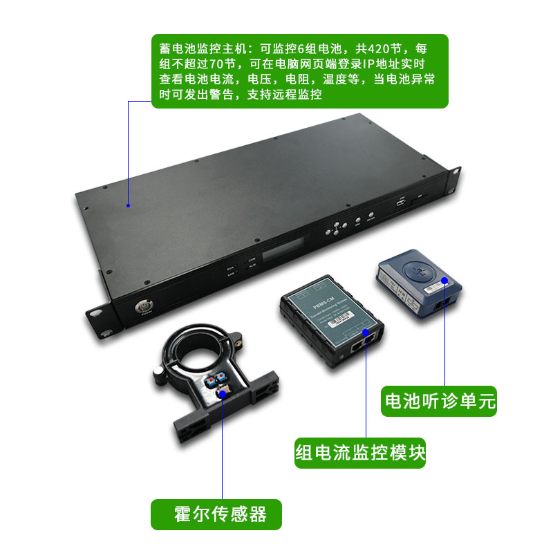 實時監(jiān)測蓄電池的電壓、充放電電流、電池狀態(tài)、內(nèi)阻、溫度先進的測量算法,無需進行大電流放電,實現(xiàn)無損測量分體式組電壓、組電流測量模塊,可根據(jù)現(xiàn)場情況靈活配置單體休眠功能,實現(xiàn)低能耗先進一鍵單體地址搜索功能快速定位機房內(nèi)告警或故障的蓄電池均衡功能,蓄電池在浮充時保持電壓均衡,使電池保持最佳活性狀;多樣的告警聯(lián)動,使突發(fā)事件無所遁形靈活配置,適用于1-6組電池的監(jiān)控,最多支持420節(jié)電池的監(jiān)控支持環(huán)形通